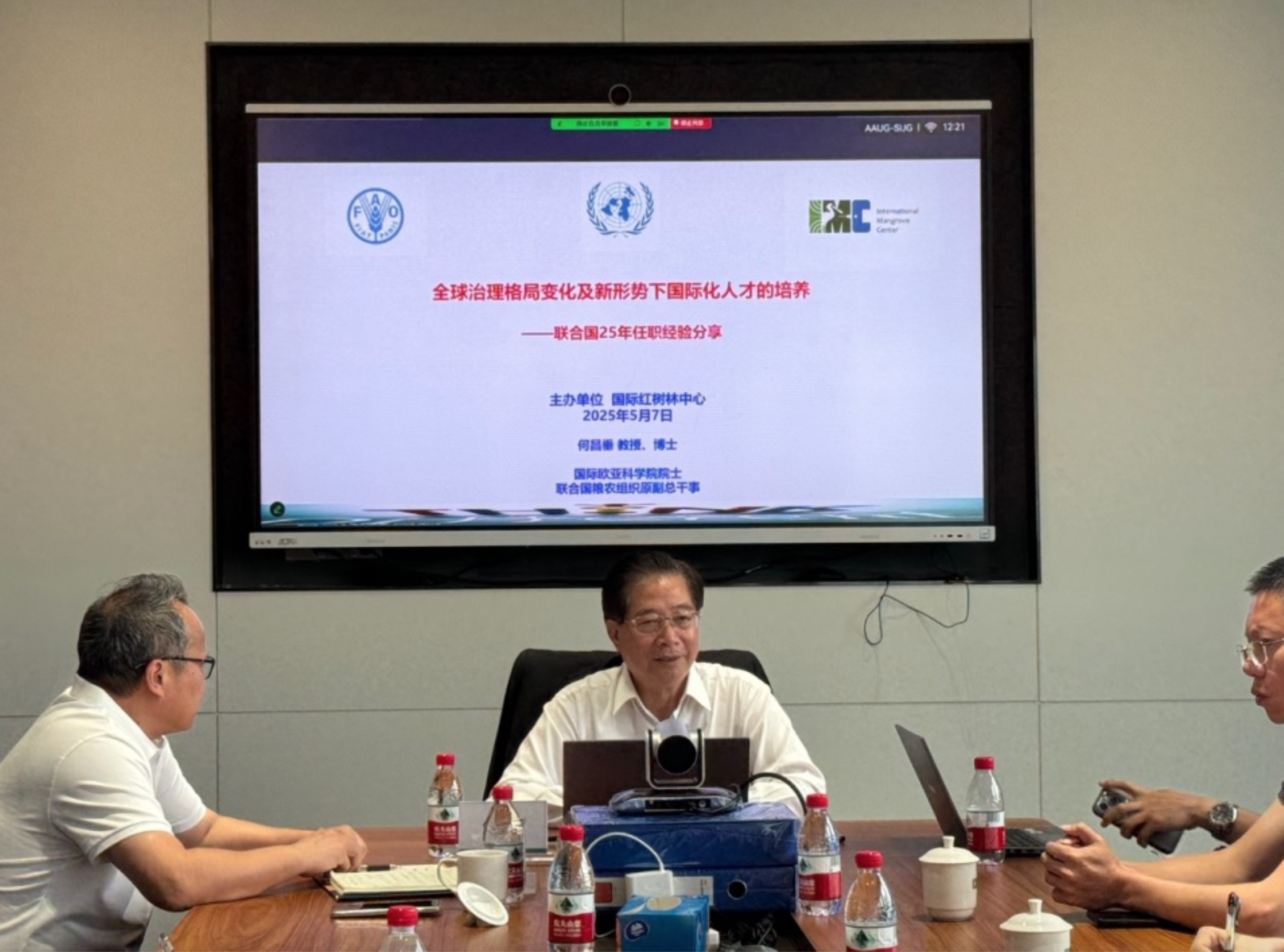 On May 7, 2025, the IMC held a lecture as one of the series of the "International Mangrove Wetland Lecture", and specially invited Prof. He Changchui, former Deputy Director General of the Food and Agriculture Organization (FAO) of the United Nations (UN), to systematically share his experience in performing his duties in the UN system around the theme of "Changes in the Global Governance Pattern and the Cultivation of International Talents under the New Situation". The lecture was presided over by Prof. Bao Daming, Director General of the Interim Secretariat of the IMC, and relevant personnel from relevant units of the National Forestry and Grassland Administration, Chinese Academy of Forestry, the China Wetland Association, the Guangdong Neilingding Futian National Nature Reserve Bureau, Tsinghua University, Xiamen University, Shenzhen University and the Interim Secretariat of the IMC participated in the study and exchange.